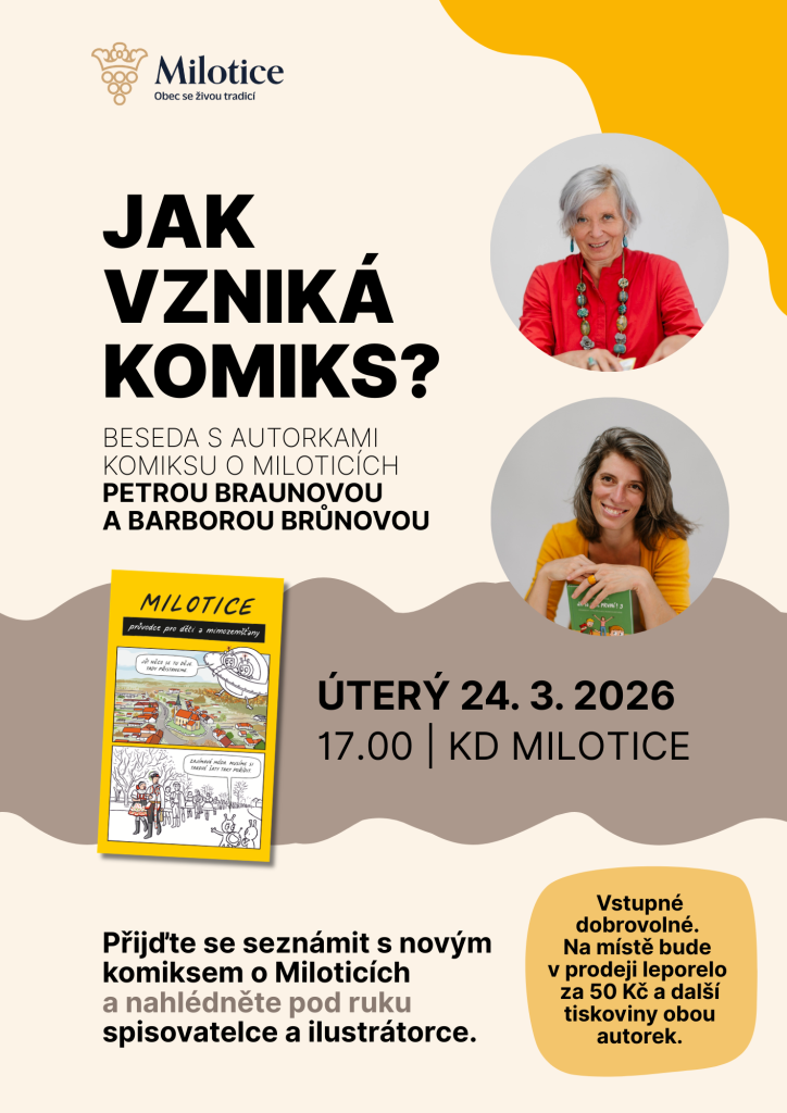 Na tyto i další otázky odpoví autorky nového komiksového průvodce Milotice – průvodce pro děti a mimozemšťany během setkání v kulturním domě v Miloticích.